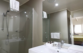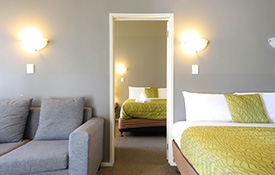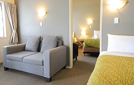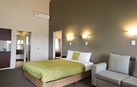 1 queen-size bed in the lounge, 1 queen-size and 1 single in a bedroom with kitchenette, tea and coffee-making facilities, great wall-hanging LCD TV, Sky TV, shower, clean toilet, beautiful spa bath and air-conditioning.